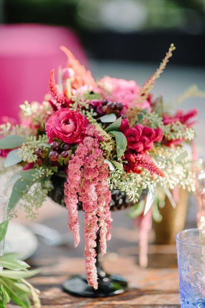 The vivacity of fuchsia takes the breath away in this large and impactful arrangement. It’s a centerpiece that boldly declares love in shades of pink and red, suitable for both outdoor ceremonies and centerpiece receptions. The cascading amaranth adds a touch of drama, making it a table adornment that’s both rustic and refined, a true reflection of a passionate romance.