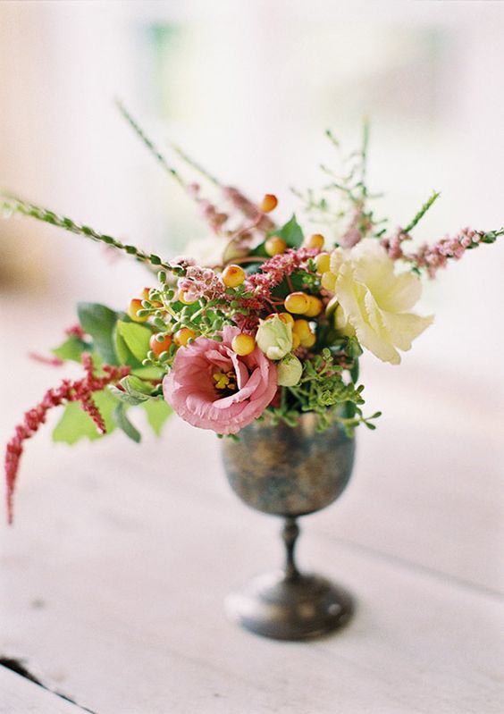 In a vintage goblet, this petite arrangement combines whimsical florals with rustic elegance, making it a perfect table centerpiece idea. It’s a sweet nod to tradition, with a mix of textures and colors that could adorn a centerpiece head table or accent a table runner with delicate grace.