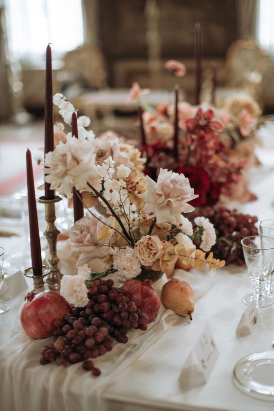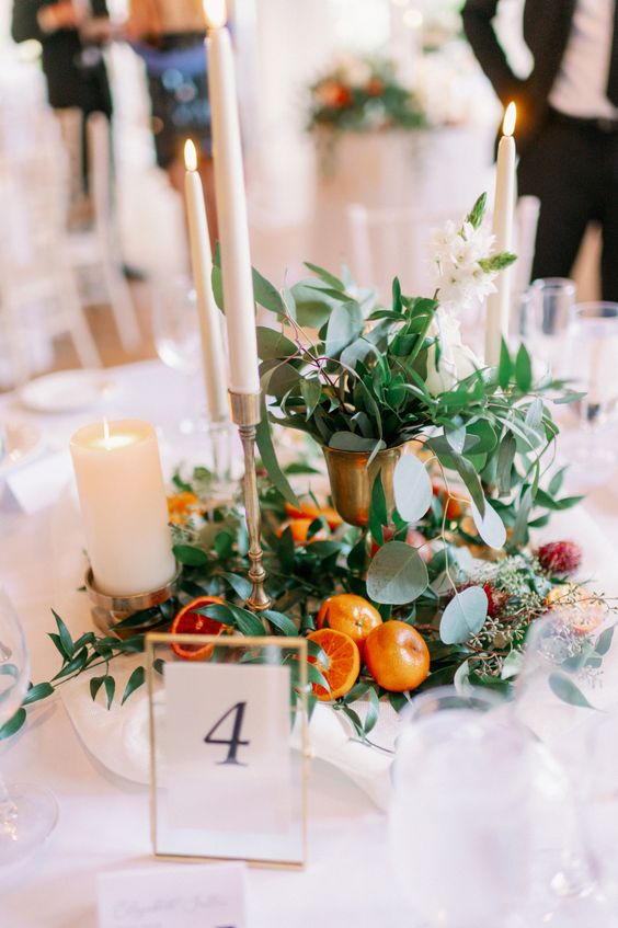 Here, the understated elegance of white blossoms pairs with the cheerful vibrancy of citrus, creating a centerpiece that’s as refreshing as it is beautiful. The green and white palette gives this arrangement a crisp, spring feel, while the inclusion of fruit adds an organic touch to a table decor that’s simple, yet undeniably chic.