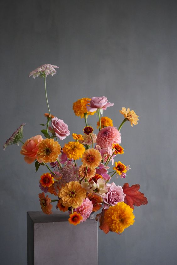 As if capturing the last rays of a setting sun, this arrangement is a mélange of golds, oranges, and pinks. It’s an embodiment of the golden hour, making it an exquisite choice for an autumn wedding centerpiece, where the warmth of the colors enhances the aesthetic of the day.