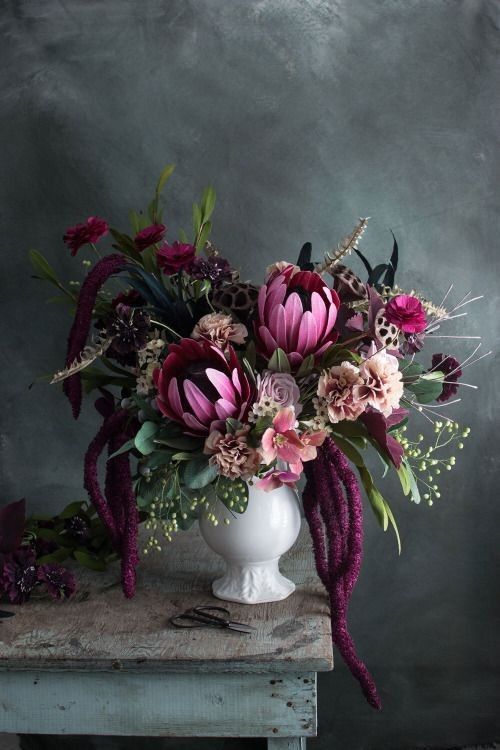 Perfect for a boho or outdoor wedding, this floral composition is a rich tapestry of deep purples and soft pinks, striking a balance between wild abandon and meticulous arrangement. The unconventional use of a white vase as a plinth showcases a large bouquet that is both grounded and free-spirited. The pink proteas stand proudly amidst a garden of roses and amaranthus, symbolizing a love that is both rare and enduring.