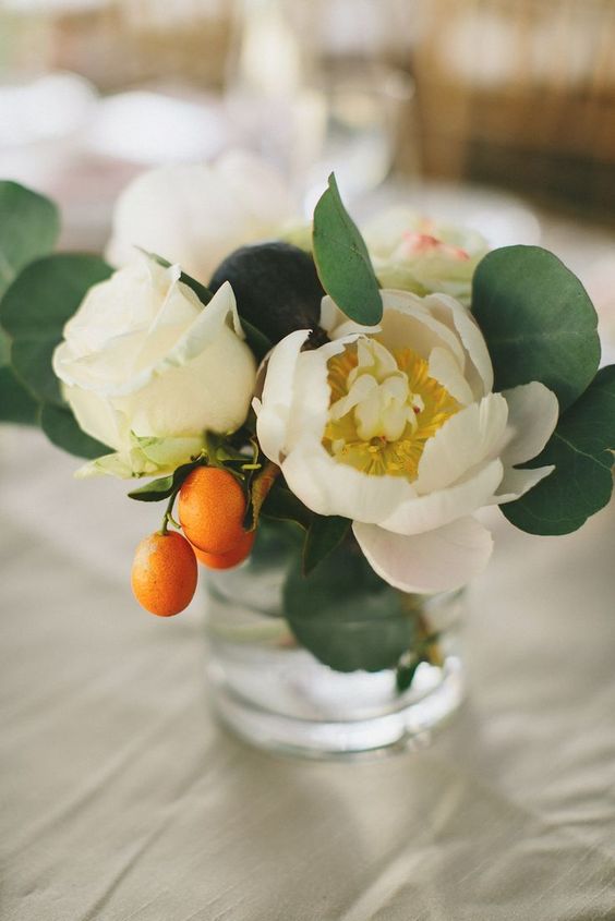 With a simple touch that speaks volumes, this centerpiece pairs the crisp elegance of white flowers with the fresh burst of citrus. It’s a simple arrangement that could beautifully accent a summer wedding table, or even add a touch of whimsy to a table simple at a spring affair. The kumquats hanging like tiny lanterns amidst the blooms add a playful nod to a boho theme, making this a delightful addition to any outdoor or garden celebration.
