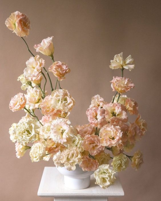As if painted with the softest brush, this floral arrangement exudes a neutral beauty perfect for a spring or summer wedding. The delicate pink and peach tones set against a creamy backdrop offer a simple yet stunning centerpiece, suited for both a modern or vintage setting. The gentle cascade of blossoms could serve as an understated yet impactful table decor, inviting guests to a dreamy, pastel-infused world.