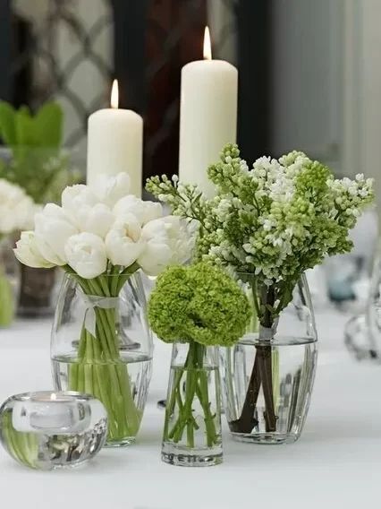 For the couple who adores spring’s renewal but prefers a minimalist aesthetic, this centerpiece arrangement offers a refreshing take. The crisp white tulips and vibrant greenery, displayed in simple glass vases, create a look that is clean, contemporary, and budget-friendly. These arrangements can beautifully grace any table, adding a touch of spring’s fresh promise.