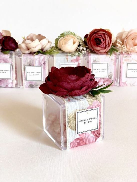 Personalization is a beautiful way to make a wedding feel intimately yours. These small, clear gift boxes, each housing a single, stunning blossom like a dark red rose, are a testament to the unique and different. They double as place cards, offering a unique and cheap alternative to traditional wedding favors and doubling as decorations.