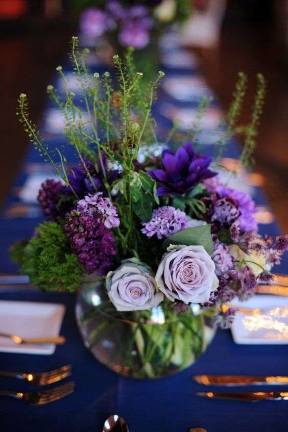 Envision a spring wedding table, vibrant with clusters of purple sweet peas and periwinkle blooms. Here, the arrangements centerpiece is not just a visual treat but a nod to the garden-fresh theme of April weddings. The incorporation of green and white accents elevates the setup, offering a different yet harmonious visual experience that could double as a welcome sign to the season’s joy.
