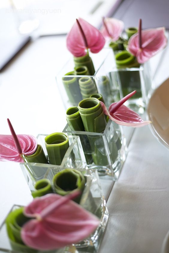 For the modern couple seeking a clean and contemporary look, here’s an alternative take on table arrangements. The juxtaposition of vibrant pink anthuriums with rolled green leaves in a simple glass vessel offers an aesthetic that’s both unique and different. This approach reflects a boho-spring vibe but can also complement an August beach wedding, showing that diy can be as striking as it is budget-conscious.