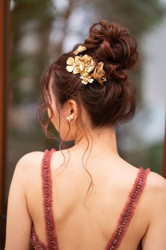 This hairstyle exudes an aura of Bohemian charm, featuring a braided updo that gracefully secures the hair away from the face. Adorned with golden floral accents, the style complements brunette locks and adds a shimmering contrast. It’s ideal for a Boho-themed wedding or an outdoor beach ceremony, offering a balance between relaxed sophistication and artistic flair.
