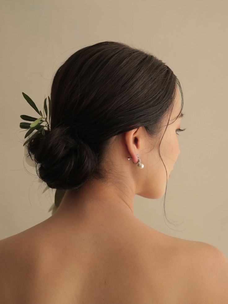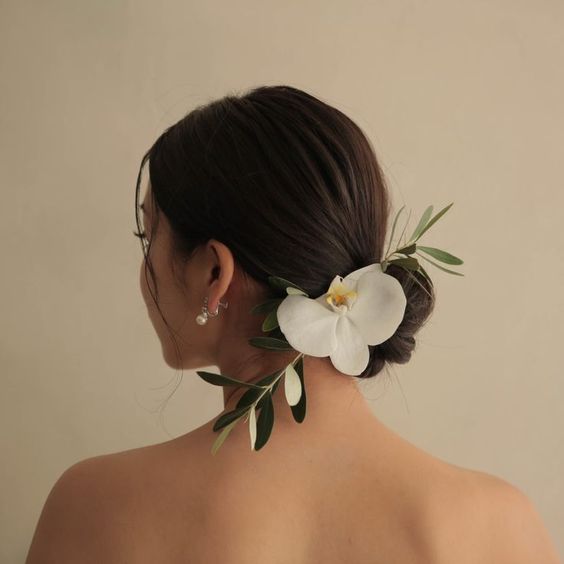 This hairstyle captures the essence of minimalist beauty with a single, stunning white orchid set against a sleek bun. The look is completed with olive leaves, adding a touch of greenery that’s perfect for a bride who appreciates simple elegance. This style is versatile for straight hair or curly hair, offering a timeless appeal.