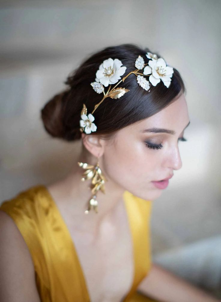 A single branch of olive leaves delicately pinned to the side of a smooth bun offers a whisper of the Mediterranean. This minimalist approach is perfect for short hair or medium length styles, and it can beautifully complement a wedding taking place in a rustic or beach setting.