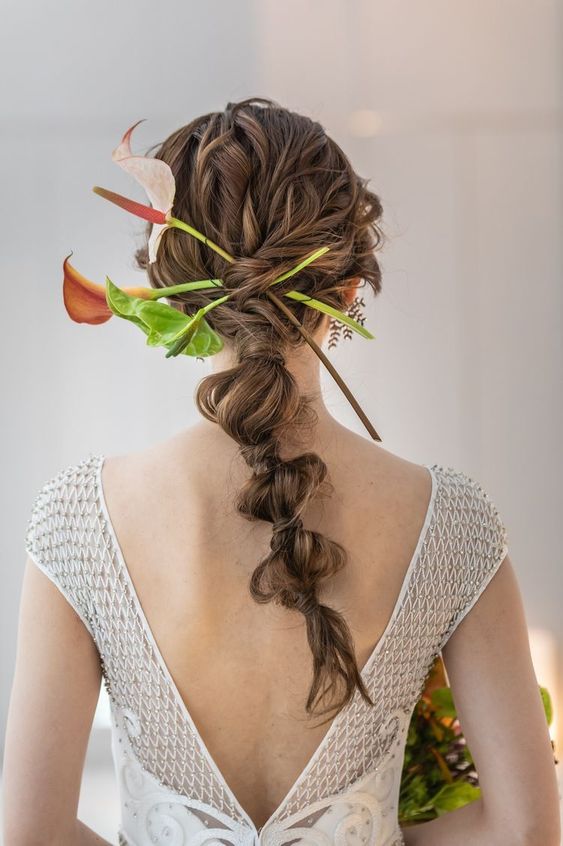 Merging Boho vibes with exotic flair, this hairstyle showcases a fishtail braid interwoven with striking calla lilies and greenery, making it an eye-catching choice for outdoor or beach weddings. Ideal for long or medium length hair, it embodies a spirit of adventure and natural charm.