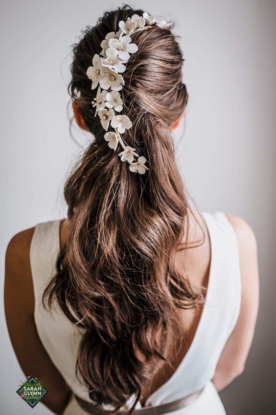 For those who admire simplicity, this half up hairstyle decorated with a delicate white floral headband offers an effortlessly chic vibe. It’s versatile enough to suit straight hair or wavy hair, and the subtle headband works perfectly as a standalone piece or paired with a veil.