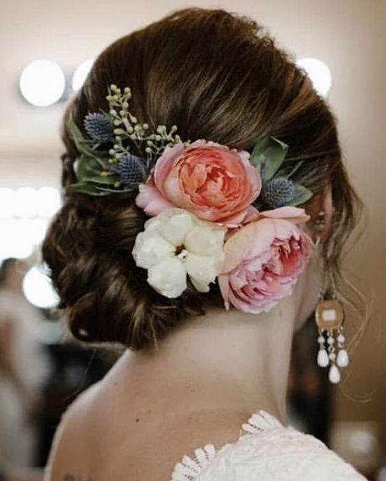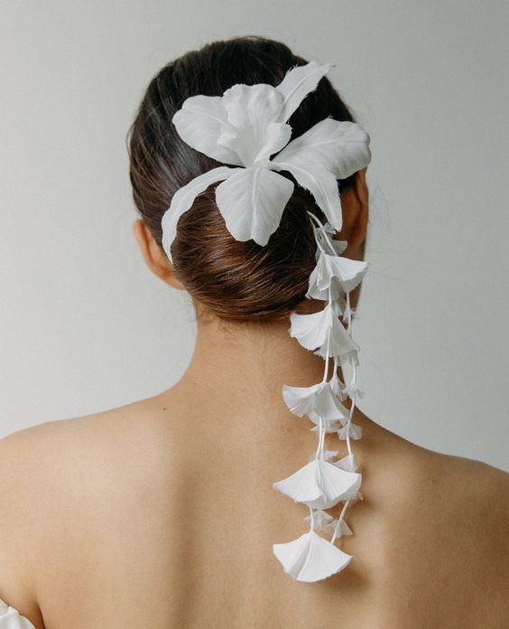 A statement piece for the bold bride, this hairstyle features a dramatic white floral cascade that flows from the crown down the back. It’s an audacious and artistic choice, perfect for a wedding with a Boho or avant-garde theme, and works well with both updos and long hair straight styles.