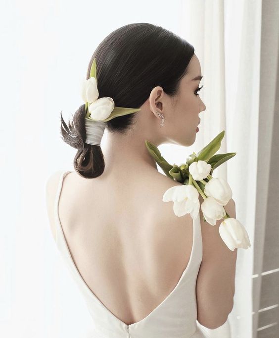 A playful and unique twist on a classic ponytail, this style features a trio of fresh tulips, their stems wrapped around the base. It’s a perfect choice for a spring wedding and adds a touch of Boho whimsy to a simple or short hair look.