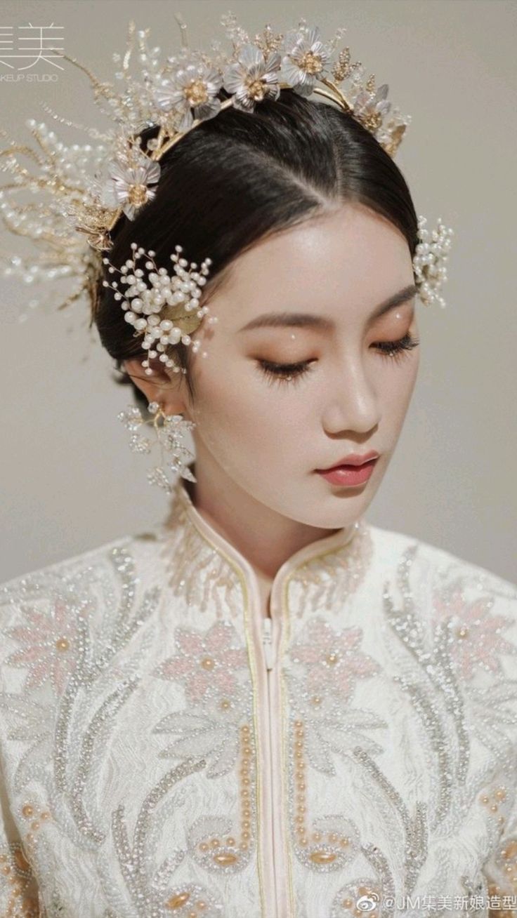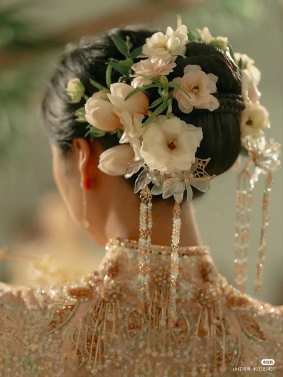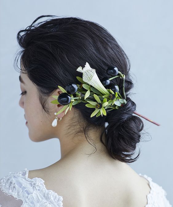 Drawing inspiration from traditional Japanese bridal hairstyles, this intricate updo is adorned with a lavish chrysanthemum arrangement, symbolizing longevity and rejuvenation. Ideal for an Asian-themed wedding, it’s a beautiful homage to cultural heritage.