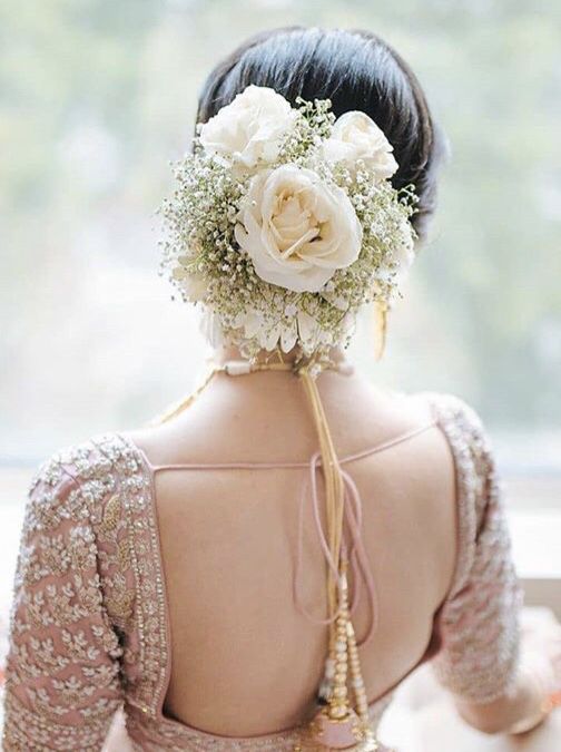 For a truly opulent statement, this low bun adorned with intricate floral details and beaded strands is reminiscent of a South Indian bridal style. It’s a majestic look that pairs well with elaborate gowns and is sure to turn heads with its intricate design and luxurious feel.