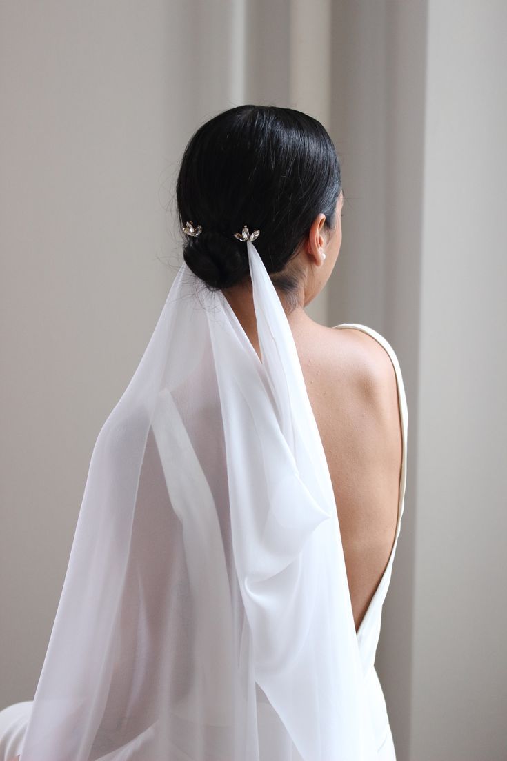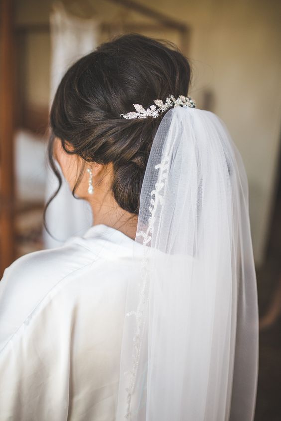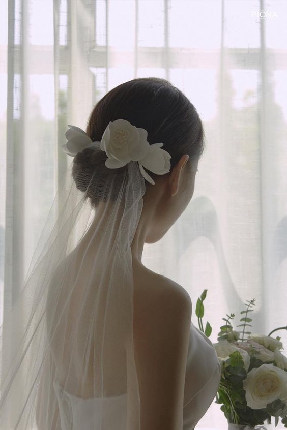 Embracing the minimalist aesthetic, this hairstyle features a neatly arranged low chignon at the nape, adorned with delicate floral pins that add a touch of sparkle. The veil is attached below the bun, allowing for a sleek silhouette that’s both classic and contemporary. This look is ideal for the chic bride seeking a black tie affair or a wedding in a grand ballroom.