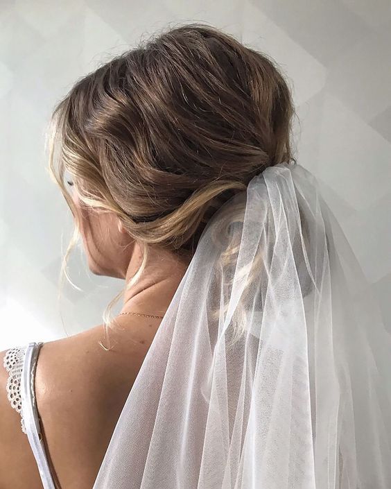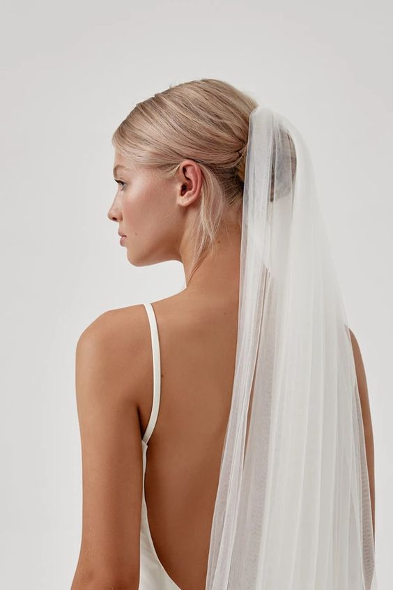 This hairstyle offers a modern twist to the classic high bun. Sleek and clean, the hair is pulled up to create a striking profile, crowned with a sheer drop veil that floats ethereally down the back, exuding contemporary glamour. This style is perfect for the fashion-forward bride who loves a mix of modern and traditional elements.