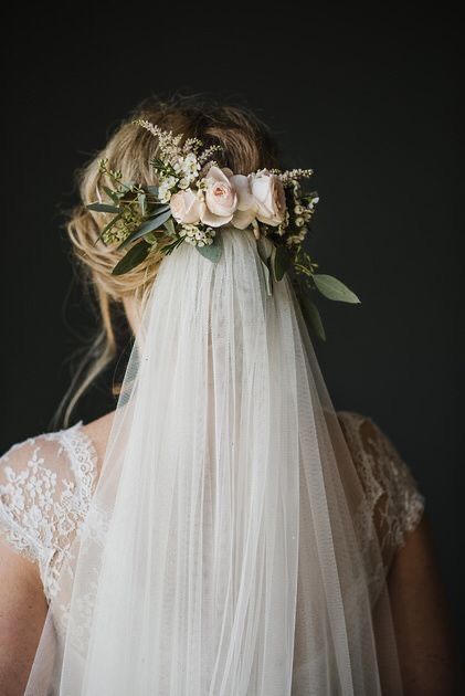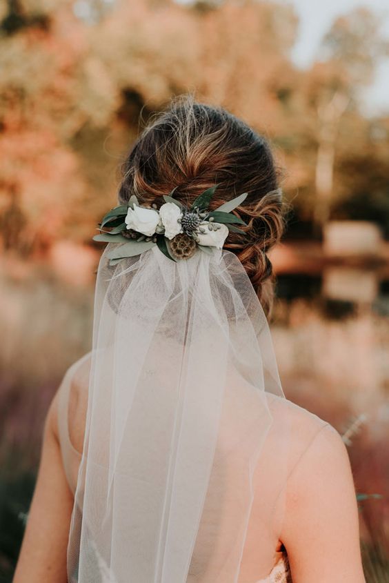 The messy bun gets a floral update in this hairstyle. Loose and carefree, the hair is styled to look effortlessly chic, while the veil, adorned with delicate flowers, adds a romantic touch. Ideal for a garden or spring wedding, this look is for the bride who dreams of a whimsical updo.