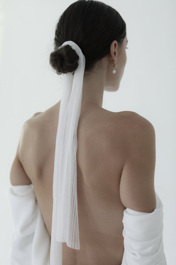 The high bun is an emblem of the timeless bride, but with a twist that speaks to the contemporary. This hairstyle elevates the traditional updo, creating a silhouette that is both striking and chic. The veil, attached beneath the bun, offers a sheer cascade that complements the hairstyle with understated sophistication. It’s the ultimate statement of a bride who is rooted in the classics but strides forward in the modern era.