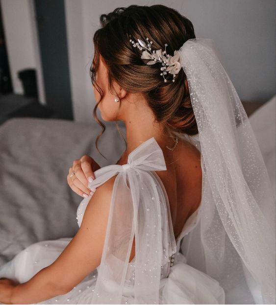 This updo is the epitome of poised elegance. The hair is fashioned into a ballet bun, offering a neat and graceful look, while the pearl-dotted veil draped over the bun adds a layer of bridal innocence and purity. This hairstyle is perfect for a bride who embraces a romantic and classic wedding day aesthetic.