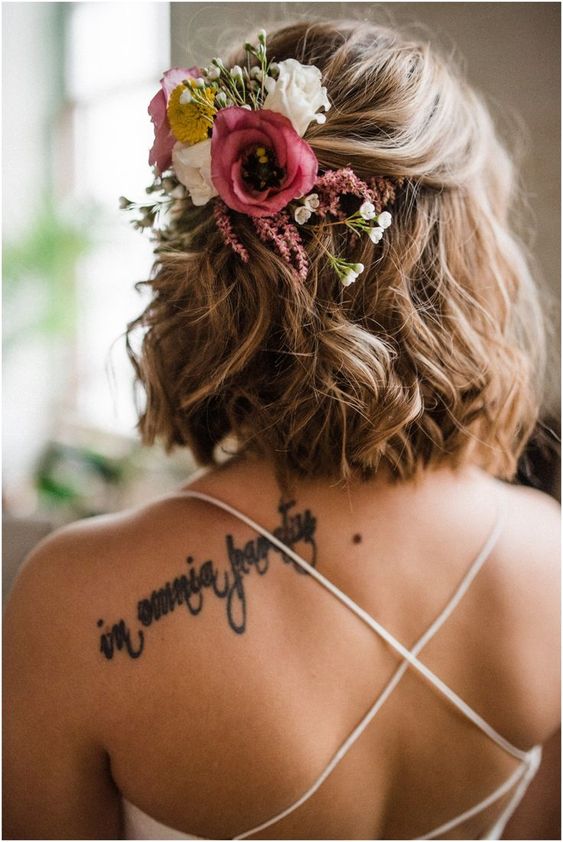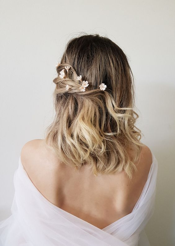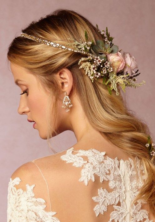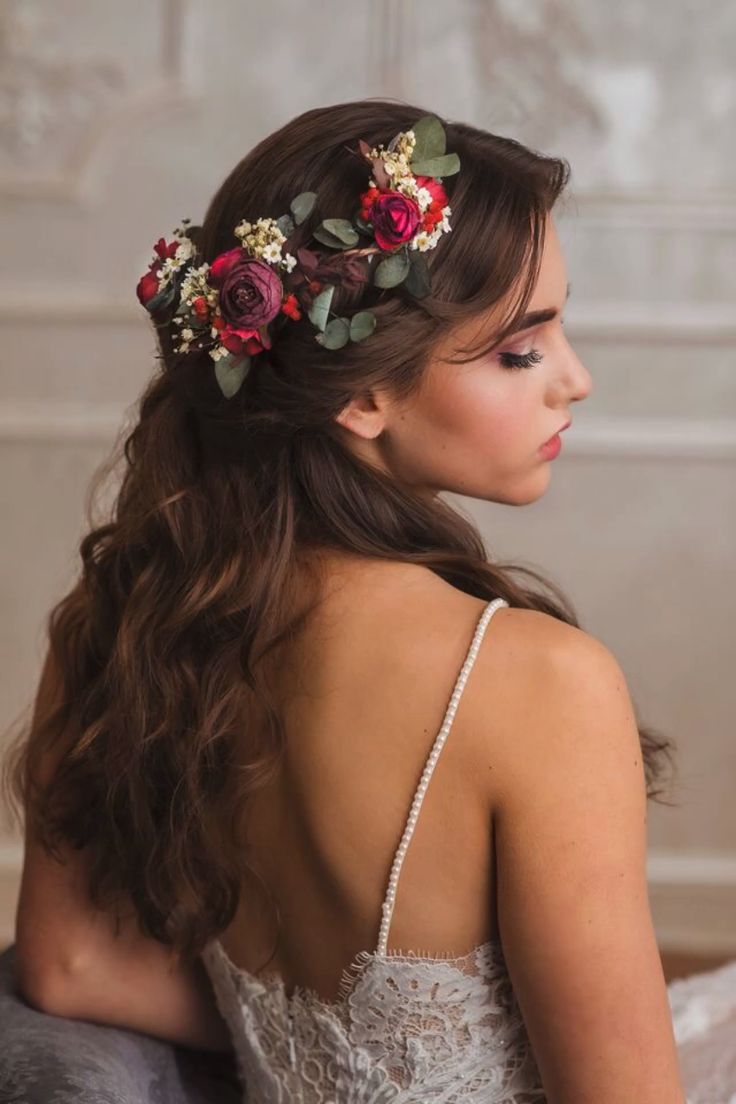 The boho-chic trend continues to reign, with soft waves gently pulled back into a loose and laid-back style. Floral accents, like the delicate flower crown seen in the first image, add a touch of nature-inspired beauty, perfect for outdoor or countryside weddings.