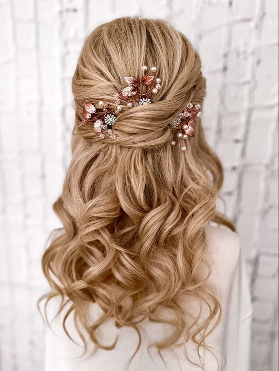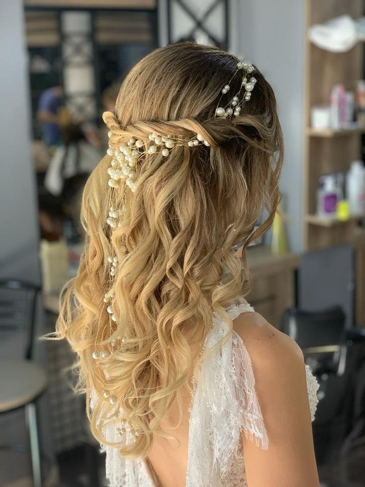 The third look captures a half-up, half-down style that’s both elegant and sophisticated, suitable for long length bridesmaid hair. With strands artistically twisted and secured at the back, the hair cascades down in loose curls. Pearl beads and golden accents are strewn throughout the hairstyle, elevating the overall ensemble and making it a perfect choice for brides who prefer a hairstyle with veil and tiara without actually wearing one.