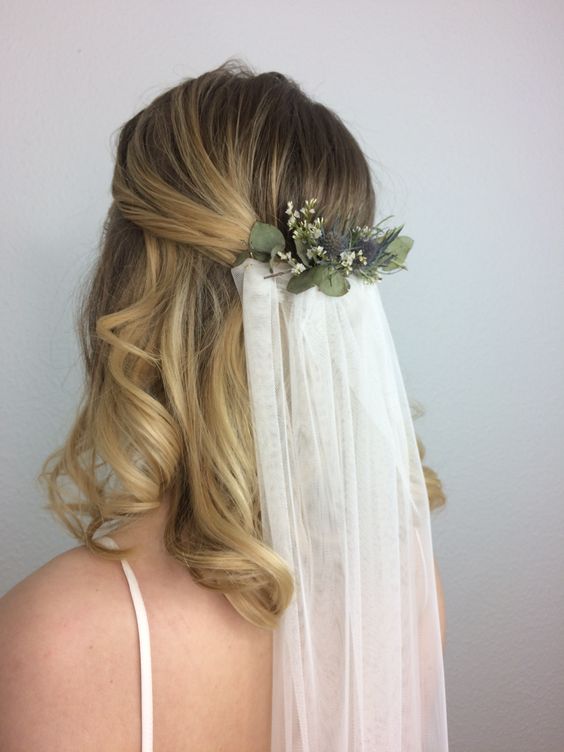 In an exquisite blend of bohemian and traditional, this hairstyle whispers a tale of modern romance. Ideal for medium length bridesmaid hair or the nonchalant bride, it features waves gently cascading down the back, while the top half is secured in a relaxed twist, accented by delicate flowers that could easily belong to a braid boho flower crown. A veil drapes ethereally from beneath the floral arrangement, adding a touch of mystique. This look is perfect for those yearning for a touch of medium length with bangs or those who prefer their straight hair given a wavy transformation.