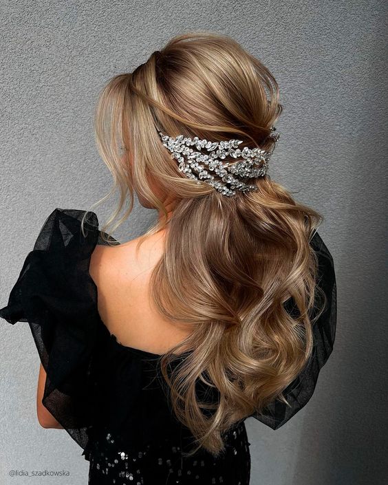 Commanding the room with a regal air, this hairstyle is a testament to timeless beauty, making it perfect for both long black hair or a shoulder length brunette. It’s a half up half down masterpiece where the hair is meticulously curled, falling in soft, romantic waves. A jeweled hair piece reminiscent of a tiara crowns the back, introducing a dash of opulence. It’s a style that says a simple DIY yet exudes the meticulousness of a tutorial at home – a perfect balance between the aesthetic of the ’90s and the modernity of 2024.