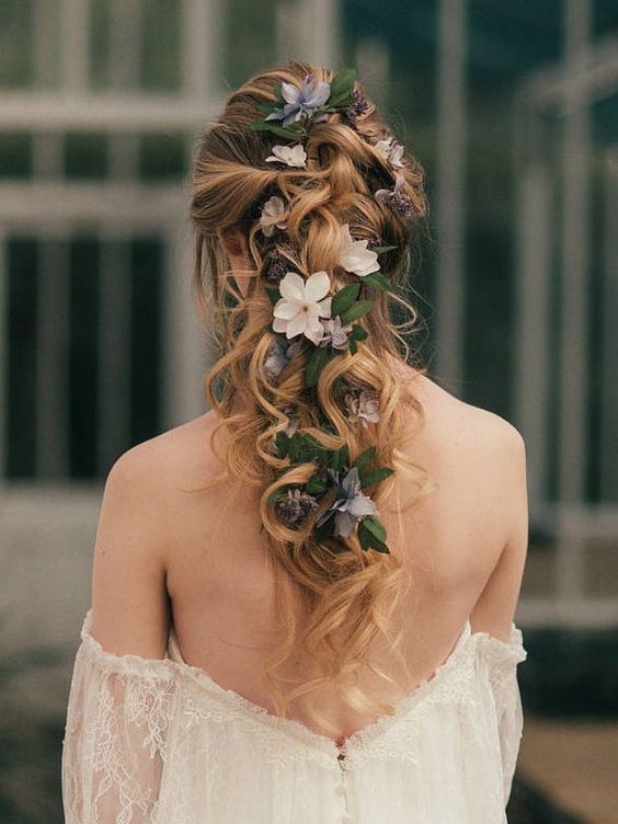 In the first image, we see an embodiment of boho chic with cascading curls entwined with delicate flowers. This whimsical arrangement speaks to a bride who embraces nature and simplicity. The flowers, set against soft waves, create a dreamy aura that is ideal for an outdoor or springtime wedding.
