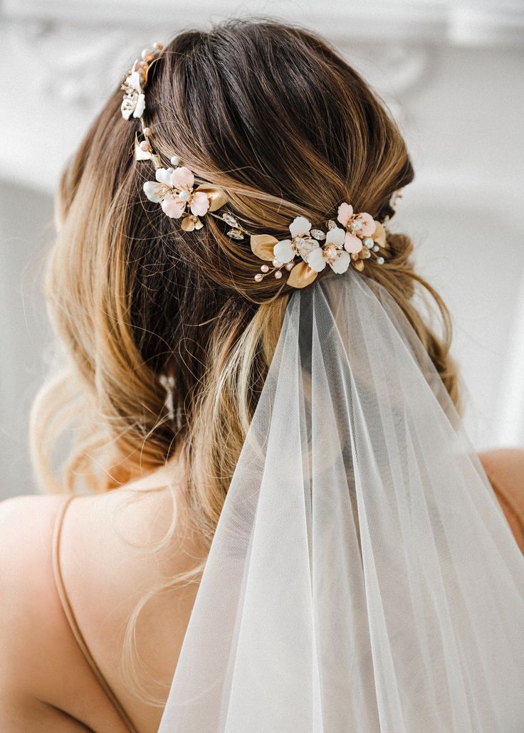 The second hairstyle presents a more structured wave, adorned with a vintage-inspired hairpiece that anchors a sheer veil. The pearl and floral elements of the hair accessory evoke a sense of old-world charm, perfect for the bride with a penchant for nostalgia.