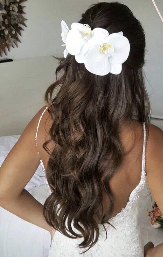Simplicity is the keynote of true elegance, and the third image is a testament to this philosophy. A single, large white orchid lends a striking contrast against dark, flowing tresses, making a statement without overwhelming. This style is particularly suited for the minimalist bride who seeks a clean and sophisticated look.