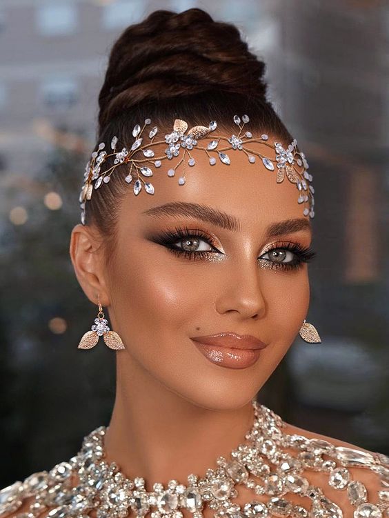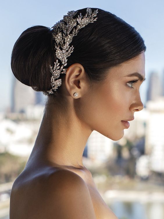 For brides aiming for timeless grace, a sleek bun at the nape of the neck adorned with a sparkling hairpiece is the epitome of sophistication. The hairpiece in the image weaves through the bun like a silver vine with delicate leaves, catching the light with every movement. This look, elegant and with veil, can accommodate a romantic, floating veil attached below the bun, allowing the intricate design of the accessory to shine through.