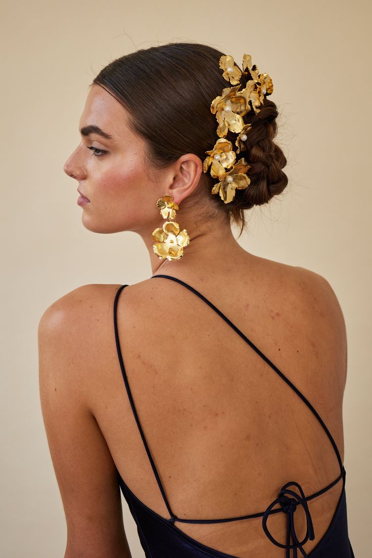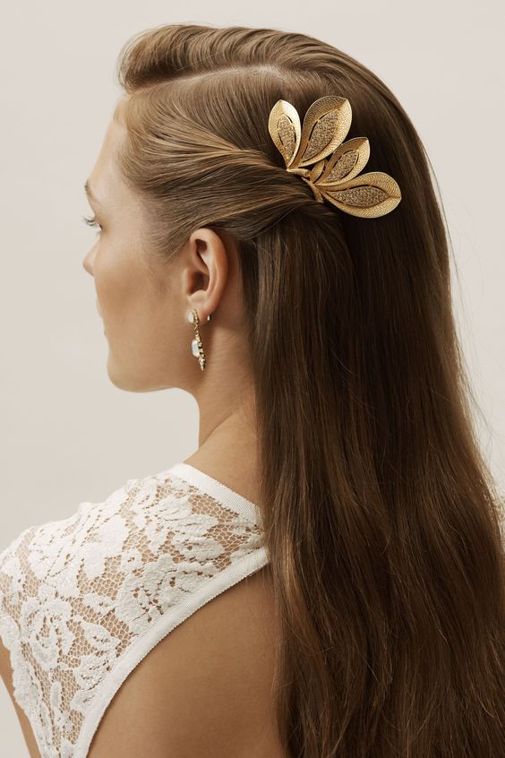 Channeling a more vintage vibe, this half-up hairstyle weaves nostalgia into modern-day nuptials. A golden leaf-like hairpiece brings a hint of boho charm to the sleek, pushed-back front, while the free-flowing long locks suggest an effortless allure. This style, perfect for a beach wedding or a romantic garden ceremony, offers a soft yet structured look, providing an ideal canvas for a veil or as a standalone statement.