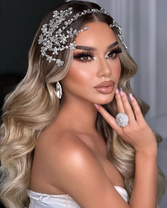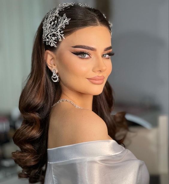 For those who imagine their wedding day as a fairytale, an elegant tiara paired with soft curls is the epitome of a princess bride. The first image showcases a model with her hair styled in glossy, cascading curls that gently fall over one shoulder, offering a look that is both regal and romantic. The intricate silver tiara, adorned with crystal and floral motifs, sits majestically atop her head, catching the light with every movement. This style is perfect for the bride who wishes to blend vintage charm with modern sophistication, ideal for an indoor ceremony or a grand ballroom setting.