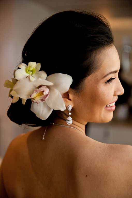 A timeless updo elegant hairstyle is reimagined with a fresh, boho twist in our second image. The bride’s hair is pulled back into a smooth, low bun, accentuated by a delicate white orchid. This look merges simplicity with botanical beauty, making it a perfect choice for a beach or garden wedding. The addition of the orchid, a symbol of love and beauty, brings a unique and personal element to the style, while the dangling diamond earrings add a touch of glamour.