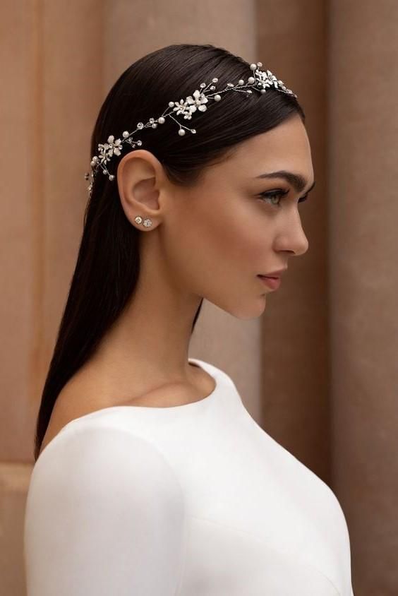 For the modern bride who appreciates clean lines and understated elegance, the fourth image presents a sleek hairstyle accentuated by a minimalist headpiece. The hair is parted in the center and pulled back into a low ponytail, offering a polished and simple look that exudes confidence and grace. The headpiece, with its delicate floral and pearl details, traces the crown of the head, providing an aura of sophistication. This hairstyle would complement a straight-lined frock for wedding and is ideal for those who favor a contemporary, minimalist aesthetic.