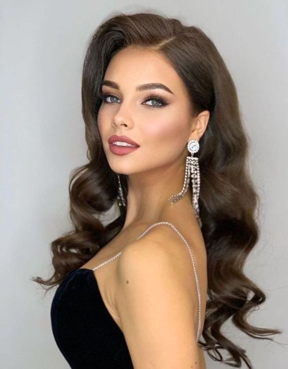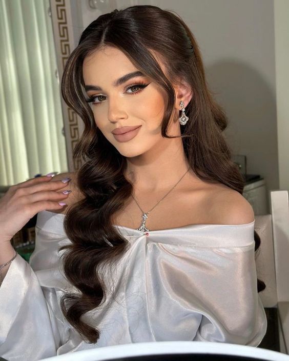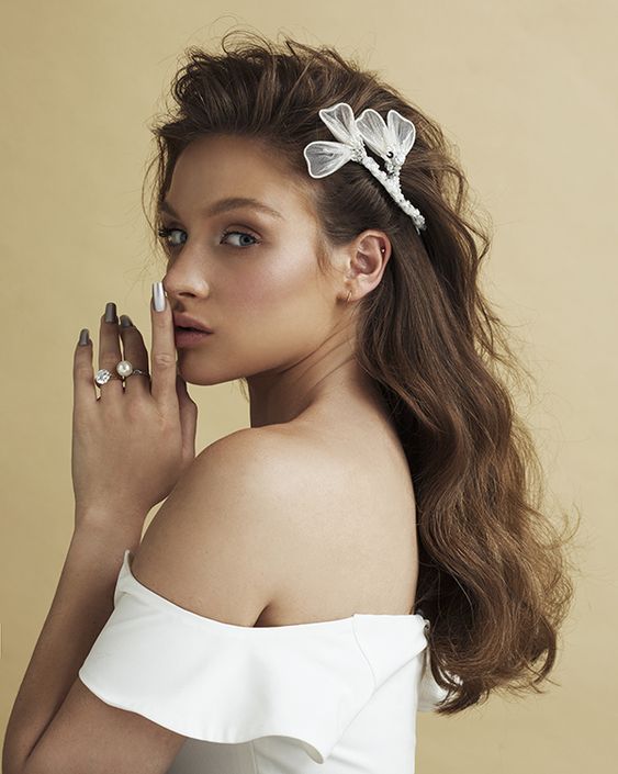 Gentle, cascading waves tied back with soft ribbons create an effortlessly romantic and feminine hairstyle. Silk or velvet ribbons in shades that complement the wedding palette can be the perfect accessory to this understated yet stunning look. Brides can opt for ribbons with beading or lace details for a more elaborate touch, or stick with simple, elegant fabrics for a minimalist vibe.