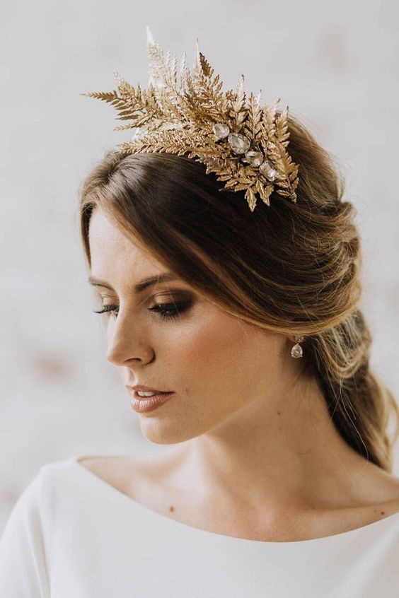 For the bride drawn to the allure of antiquity, this hairstyle is crowned with a golden leaf garland reminiscent of a Grecian goddess. The accessory weaves through soft, natural curls, offering a regal and boho aura. It’s a style that harmonizes with an array of wedding themes, from a sun-kissed beach ceremony to an opulent indoor affair.