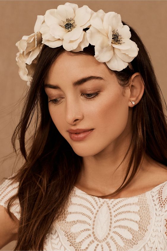 The bohemian spirit thrives in this effortlessly chic hairstyle, where natural grace meets whimsical charm. A crown of oversized boho white flowers sits atop loose waves, creating an ethereal frame for the face. The flowers appear fresh and full of life, with delicate details in the center, enhancing the overall softness of the look. It’s a style that breathes with veil romantic vibes and is perfect for a beach or garden wedding.