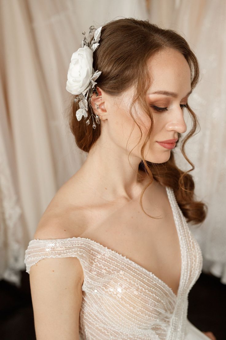 Embodying elegant sophistication, this hairstyle features a side-swept look with cascading curls, brought together by a stunning white floral piece adorned with silver leaves. The accessory adds a touch of nature-inspired beauty, making it a sublime choice for styles with veil brides who favor a blend of classic and contemporary. It speaks to the bride who cherishes timelessness with a dash of opulence.