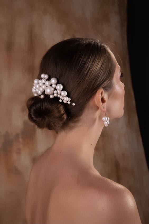 A vision of classic beauty, this updo is elevated with the lustrous glow of pearls. The bun is sleek and crafted to perfection, while a cluster of pearls rests to one side, giving a nod to traditional elegant bridal styles with a modern twist. It’s a luxurious choice for bridesmaids or the bride herself, imbuing a sense of grace and formality to the nuptial ensemble.