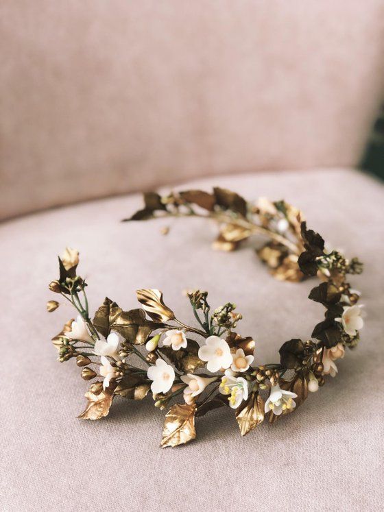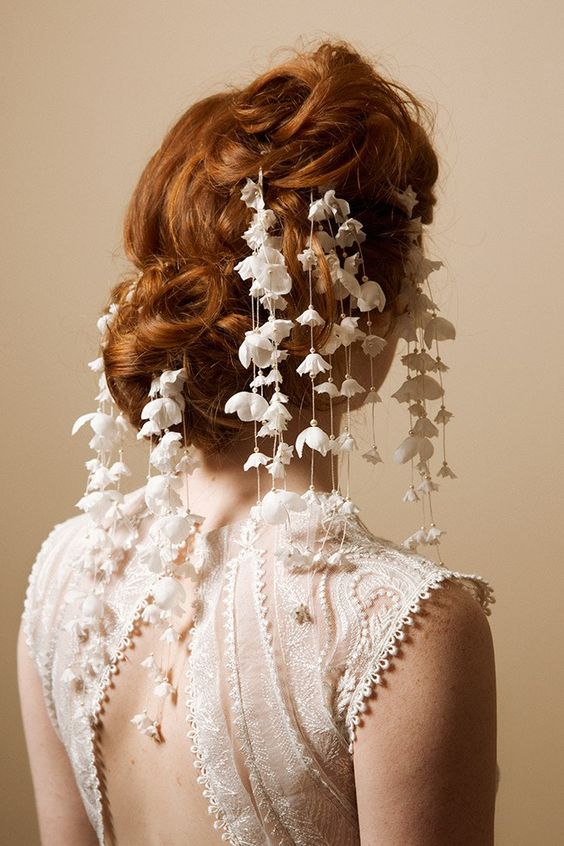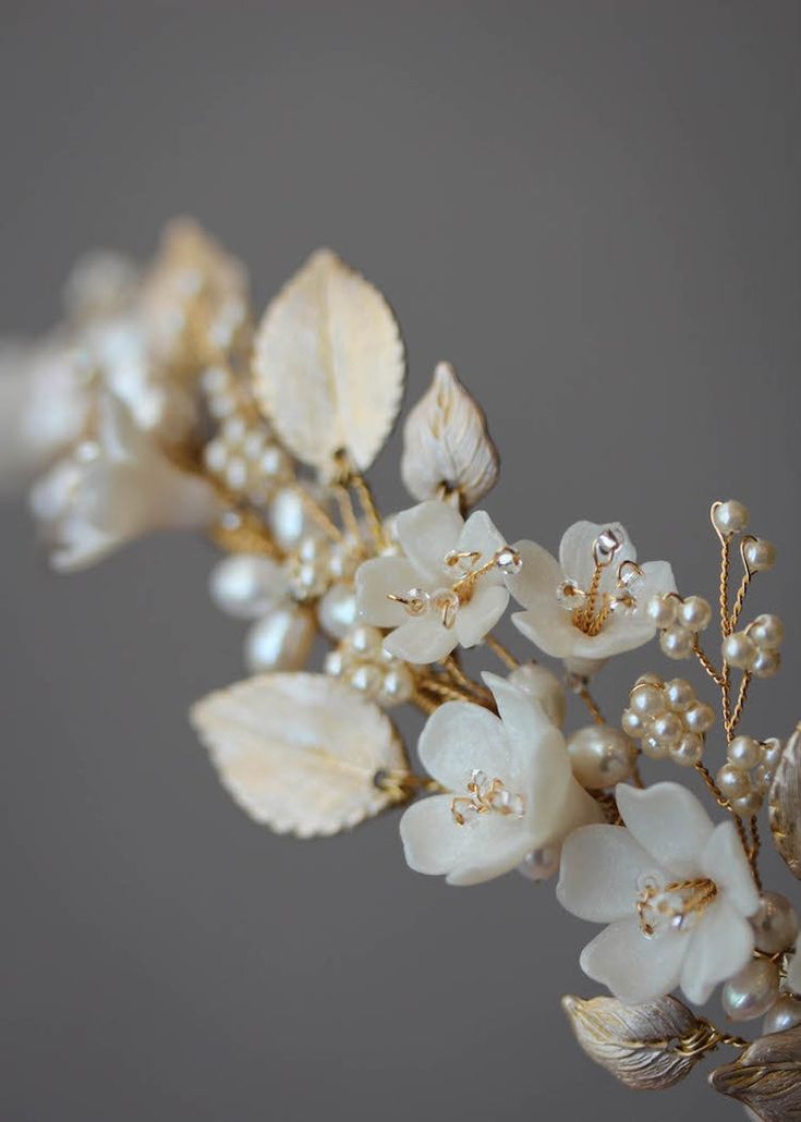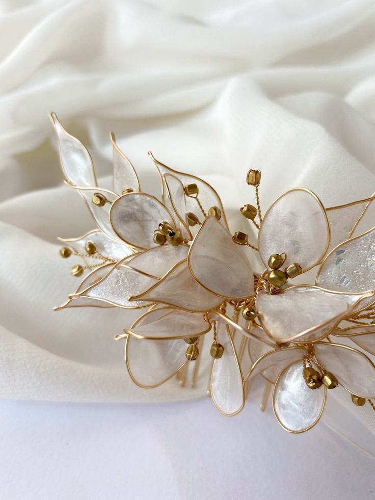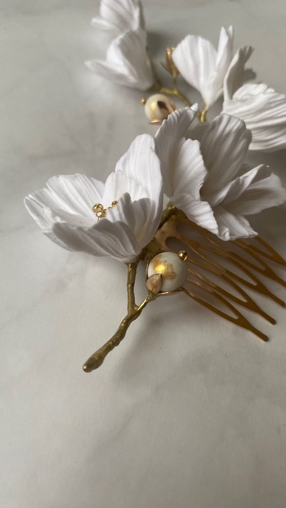 In a celebration of craftsmanship, this diy-inspired hair accessory captures the essence of porcelain beauty with its sculpted white petals. The gold-toned branches and pearl details resonate with the bohemian and vintage aesthetics, ideal for an ethereal updo or as a whimsical touch to curly hair. Its versatile design complements both medium and long hair, making it a dreamy addition for the boho bride.