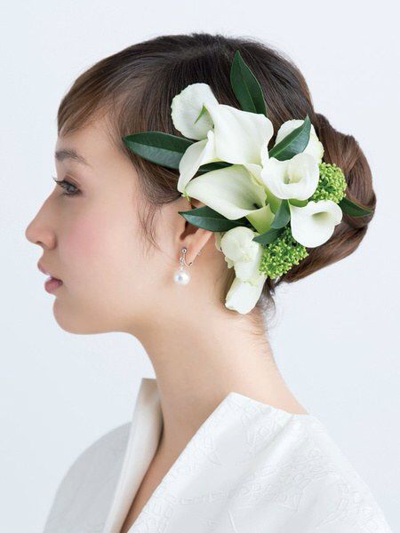 Drawing inspiration from the East, this Chinese-influenced hair accessory with white orchids and lush greenery epitomizes simple beauty and serenity. It is an exquisite choice for an updo or to accentuate a sleek low bun in a civil ceremony. The green foliage adds a touch of natural freshness, perfect for the bride seeking a unique accessory that honors cultural beauty and sophistication.