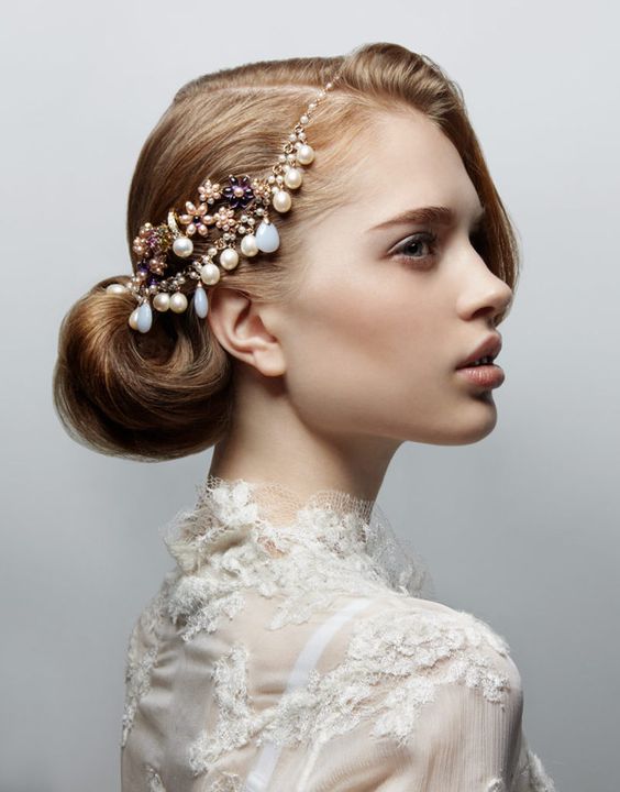 This hairpiece is a cornucopia of splendor, perfect for the bride who seeks to blend vintage charm with regal grace. Encrusted with pearls and golden beads, it adorns a classic sleek low bun, making it a grand choice for a civil or traditional wedding. It’s an exquisite updo accessory that complements long hair with a straight or side part style, bringing a sense of unique and timeless elegance.