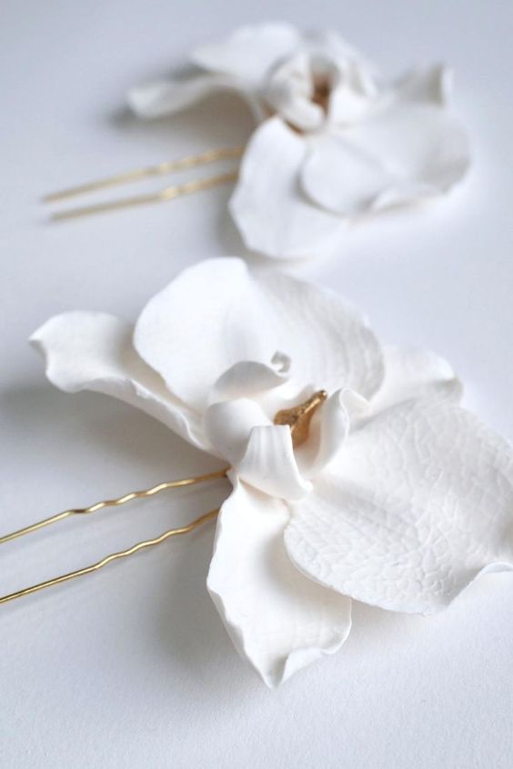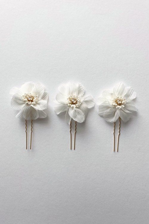 A trio of ethereal white flowers, each centered with a golden pearl, offers a dreamy addition to any bridal hairstyle. These simple yet unique pieces capture the essence of boho chic and are versatile enough for short hair, medium styles, or even scattered through a long hair updo. They are the quintessential DIY touch for a rustic or beach wedding, providing a delicate whisper of vintage romance.