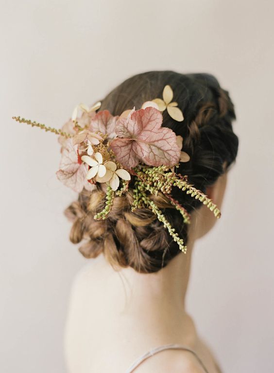 A crown of golden leaves and white blossoms offers a royal aura to the bride’s ensemble. This unique headpiece is a match for vintage-inspired weddings and is stunning against long hair with curtain bangs or a medium updo with highlights. It’s a simple yet bohemian accessory, equally suitable for a civil ceremony or a grand church wedding, infusing the day with a golden glow of elegance.