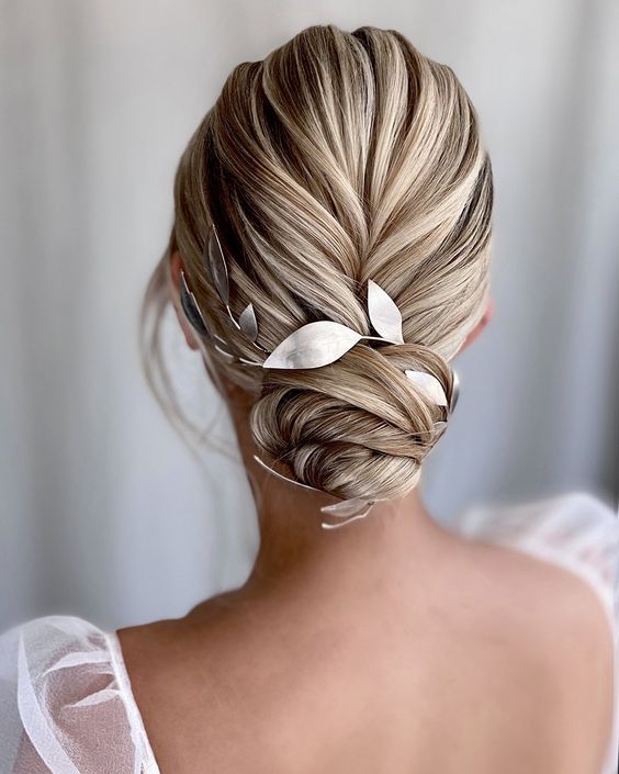 In a graceful nod to contemporary design, this silver hair accessory, with its metallic leaves, weaves through an updo like a gentle breeze. This piece complements a straight hair style or adds a modern twist to curly hair. It’s a versatile choice that suits a civil ceremony, boasting a simple yet sleek design that will appeal to the minimalist bride who enjoys aesthetic touches with a 90s vibe.