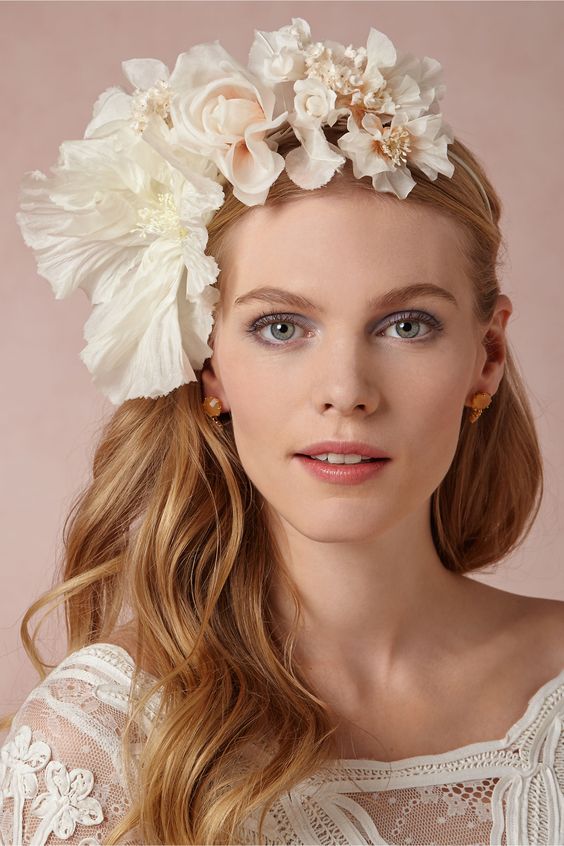 This hair accessory, featuring oversized floral elements, makes a bold and beautiful statement. The combination of soft, creamy petals with delicate pearl centers creates a striking contrast, perfect for a bohemian or vintage wedding. It’s a choice that pairs well with long hair straight or a medium length with curtain bangs, infusing the bridal look with a unique blend of drama and elegance.