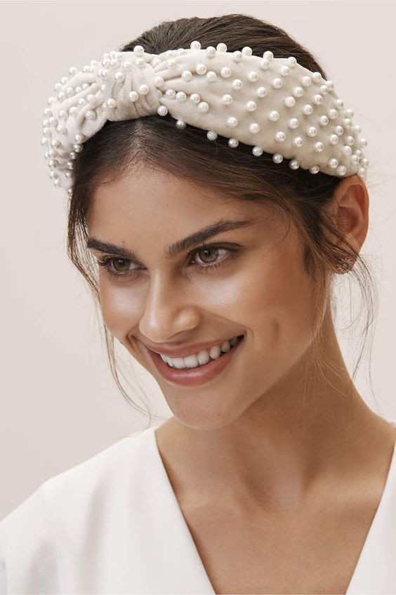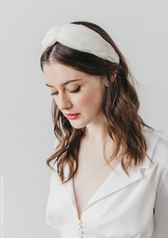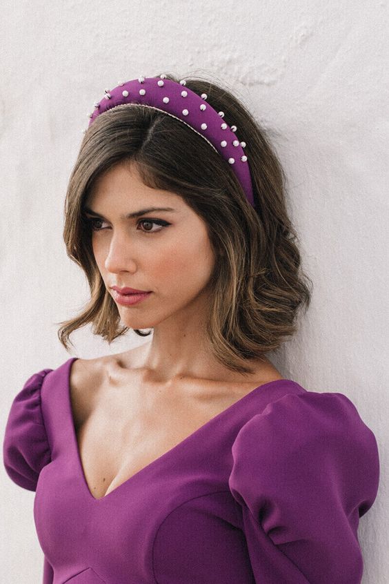 For a more modern and bold statement, the ninth style features a vibrant velvet headband adorned with pearls. This confident look is a fantastic choice for a black tie event or a cocktail party, offering a pop of color and a regal vibe. The headband sits atop wavy hair, making it a versatile option for medium to long hair. It’s an easy yet impactful way to accessorize and complement a wedding guest ensemble.